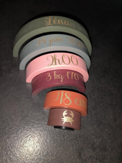 Chaque pièce peut être gravée au prénom , la date de naissance de l'enfant ou un motif pour en faire un modèle unique .
