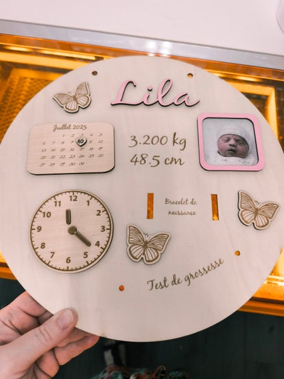 De forme ronde personnalisable a 100% . Communiquez moi lors de votre commande le prénom, la date de naissance, le poids, la taille et l'heure ainsi qu'une photo du bébé