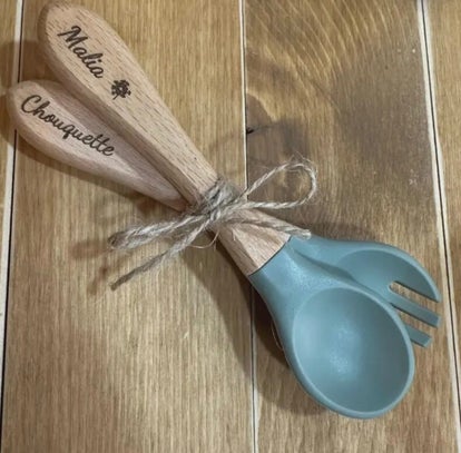 Offrez un souvenir tendre et pratique avec ce lot de couverts comprenant une cuillère et une fourchette en silicone coloré avec un manche en bois personnalisable .